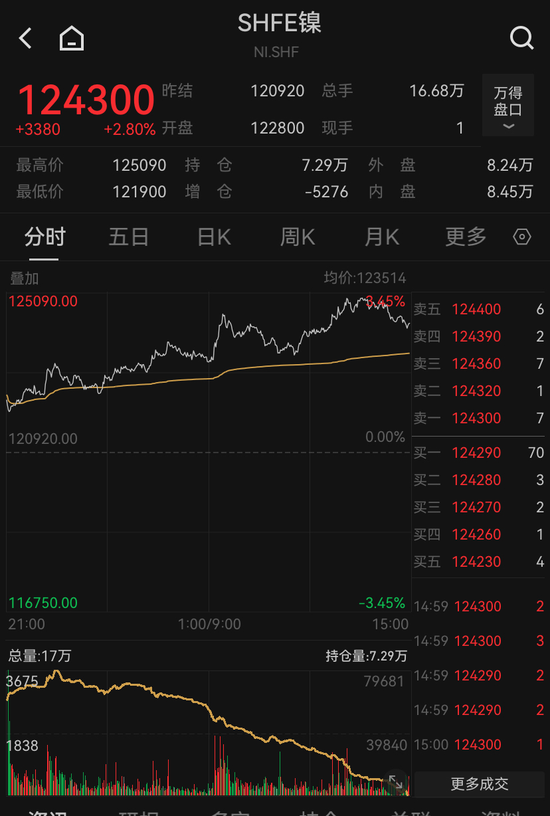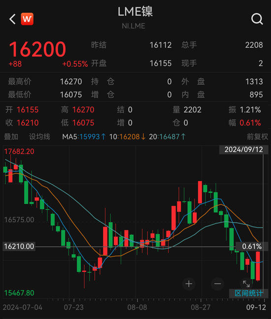 受该消息影响,国际镍价应声上涨。当地时间9月11日,伦敦金属交易所镍期货上涨2.47%,盘中高点触及16145美元/吨;截至记者发稿时,该品种再度上行至16200美元/吨。北京时间9月12日,沪镍主力合约盘中也涨超3%。
