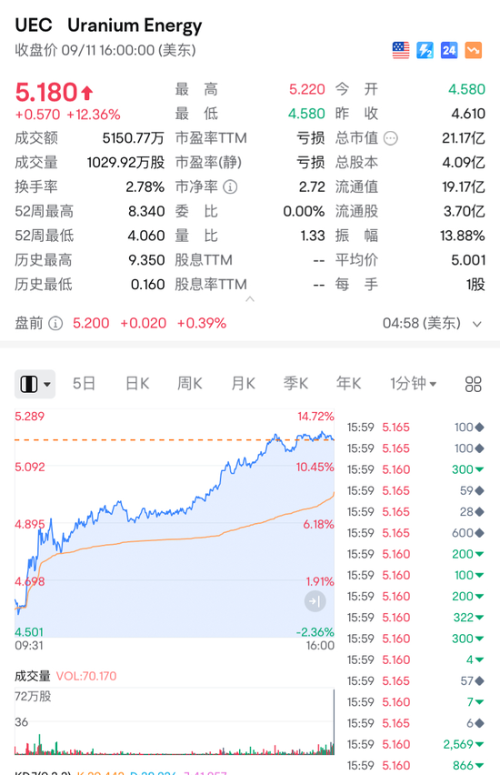 当地时间9月11日交易的美股铀矿板块同样大涨。截至收盘,丹尼森矿业涨近7%,Energy Fuels涨超8%,Encore Energy、Centrus Energy涨近10%,Uranium Energy涨超12%。