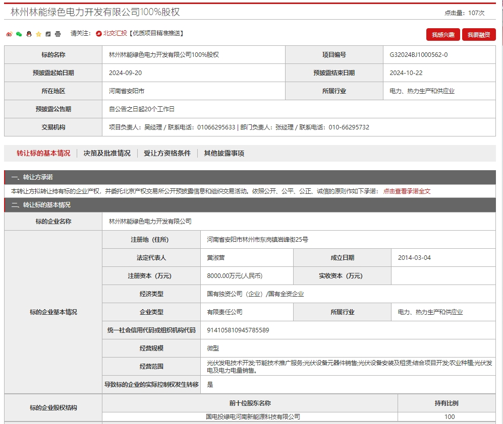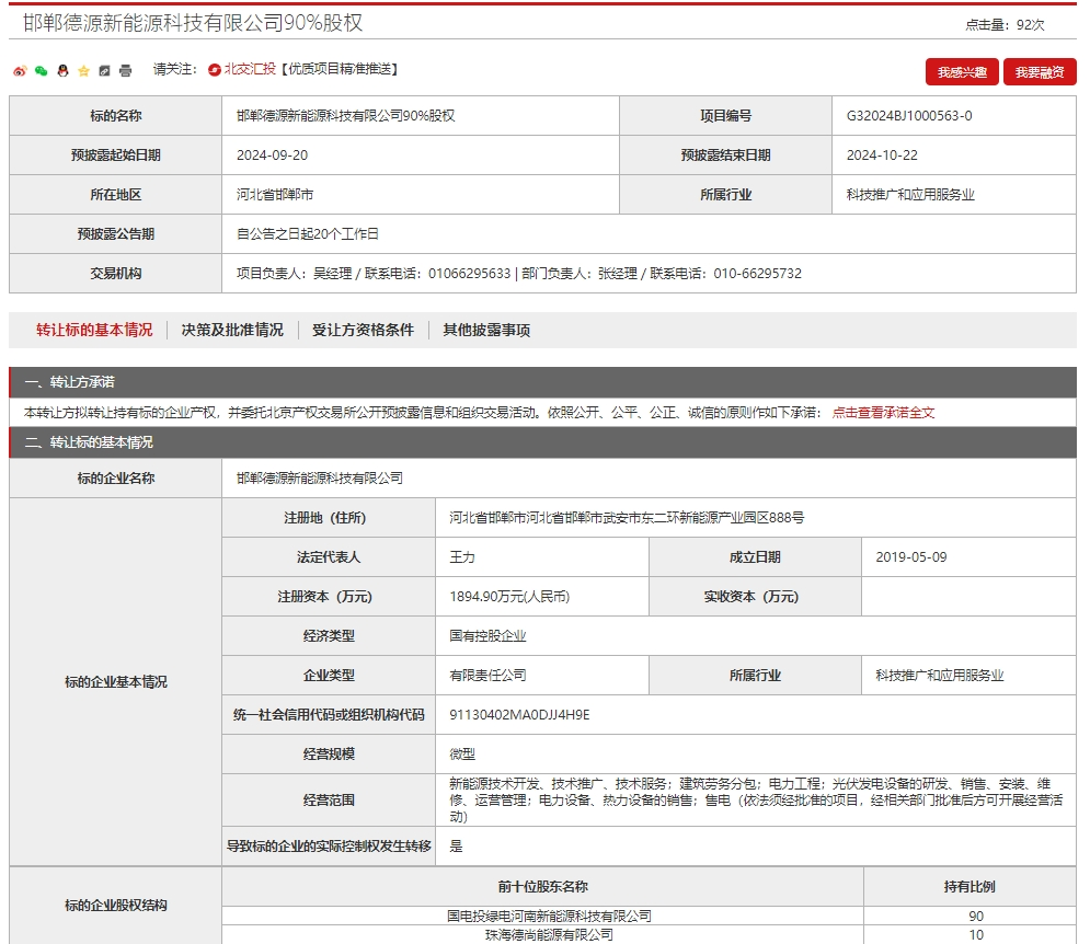近日,据北京产权交易所网站显示,邯郸德源新能源科技有限公司的90%股权及林州林能绿色电力开发有限公司的100%股权均挂牌转让。两家公司转让方为国电投绿电河南新能源科技有限公司,控股股东国家电投。