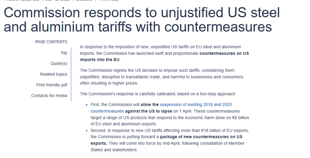 首先,欧盟委员会将允许暂停于2018年和2020年实施的针对美国的现有反制措施于4月1日失效。这些反制措施针对一系列美国产品,以应对对价值80亿欧元欧盟钢铁和铝出口造成的经济损害。 其次,针对影响超过180亿欧元欧盟出口额的新美国关税,欧盟委员会正在提出一套针对美国出口的新反制措施。在与成员国和利益相关者协商后,这些措施将于4月中旬生效。总而言之,欧盟的反制措施可能适用于价值高达260亿欧元的美国商品出口,这与美国关税的经济范围相符。